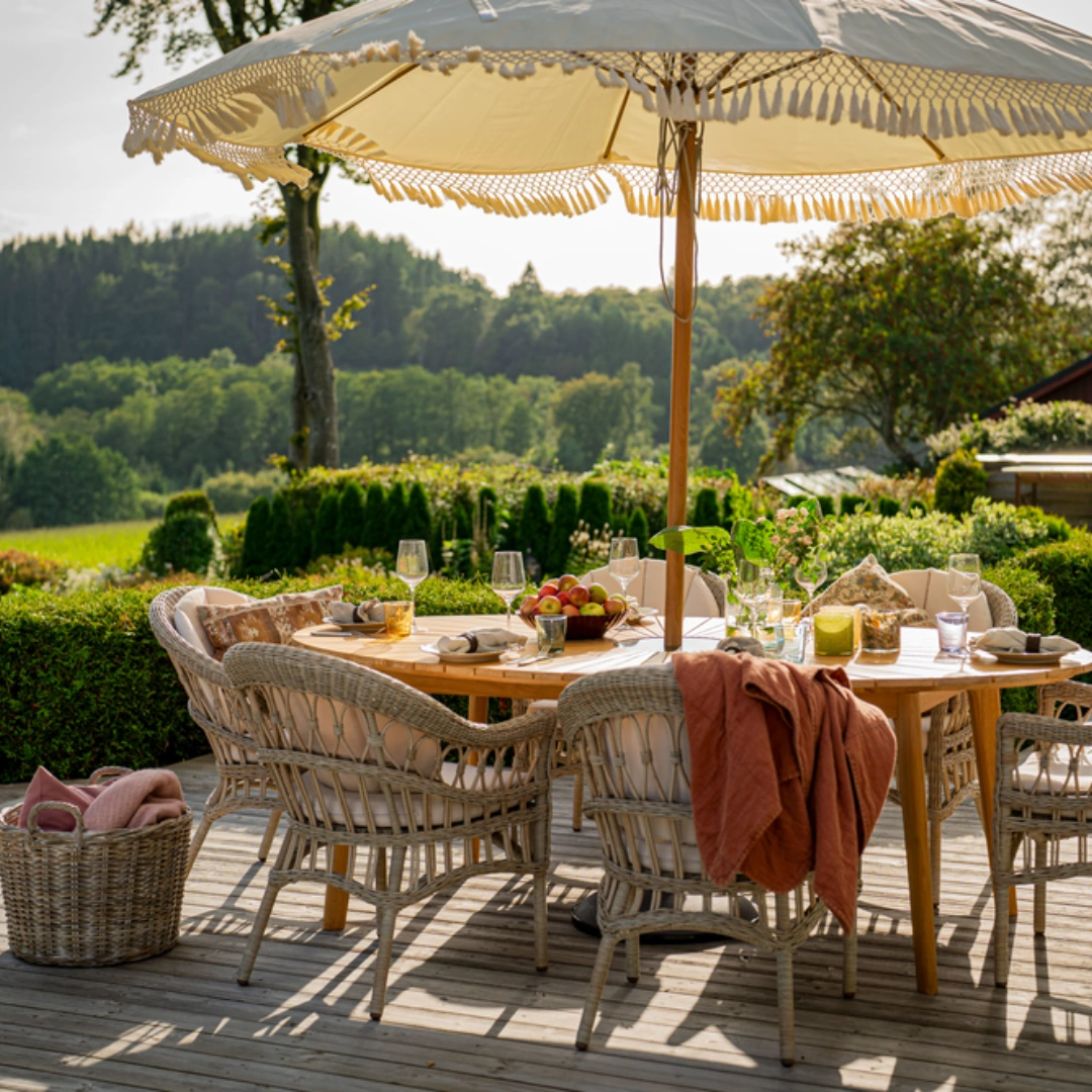 En klassisk traditionell möbelserie i modern vacker design. Tillverkad i obehandlad FSC-certifierad teak av högsta kvalité. Ett hållbart materialval som blir vackrare för varje år som går. Teaken åldras med tiden och ger en vacker silvergrå patina. Solfjäderformad bordsskiva med centrerad granitskiva med hål för parasoll. Sandhammaren kombineras fint ihop med våra övriga serier som bland annat Himmelsnäs, Ringsjö, Dallas och Nova.