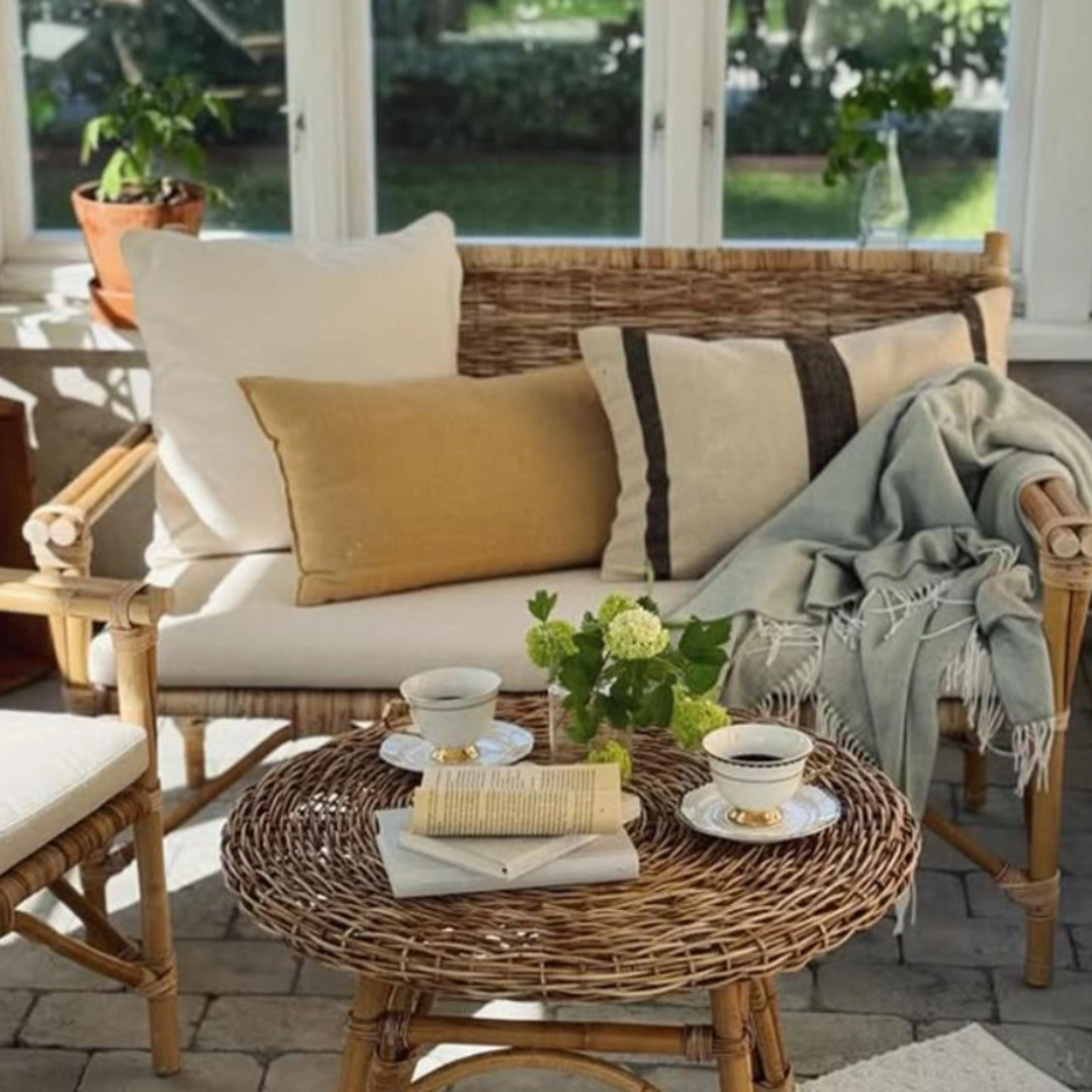 Mysig modern möbelserie i naturrotting. Att tillverka en möbel i naturrotting är ett rent hantverk. Det naturliga materialet ger varje enskild möbel en unik karaktär och ingen är den andra lik. För att skapa en mer naturlig stil har man i den här gruppen valt att behålla skalet på rottingen. Dyna i off white linne ingår.